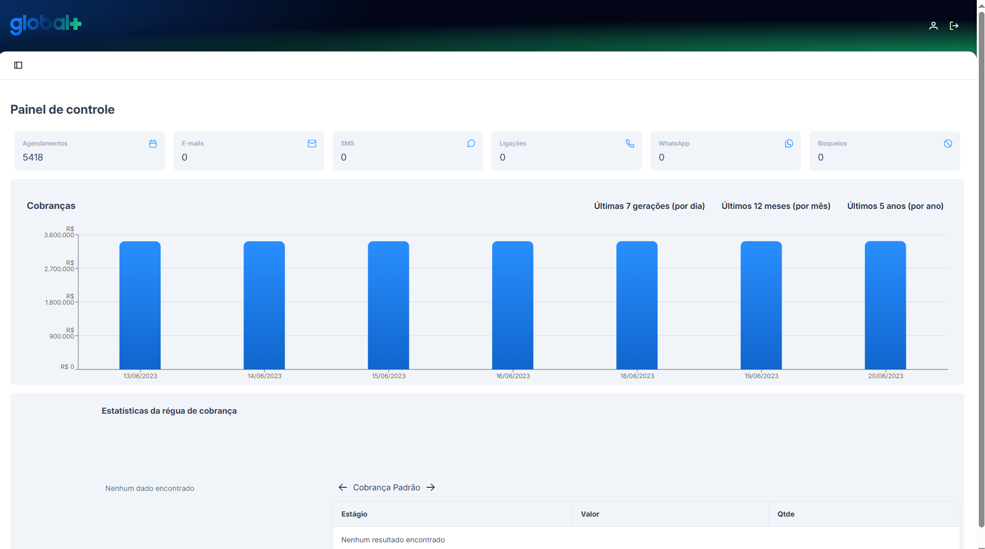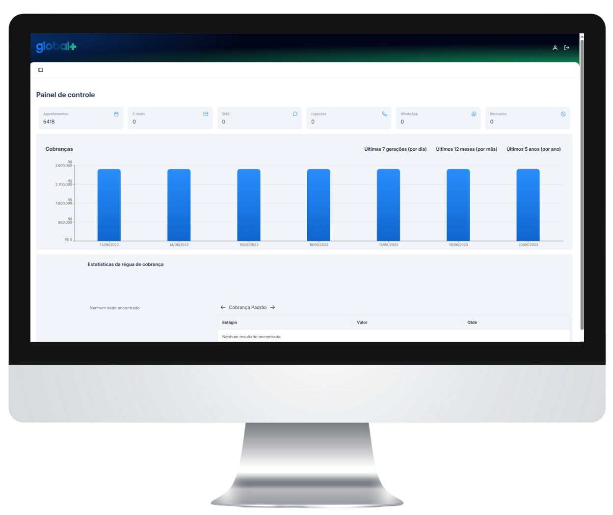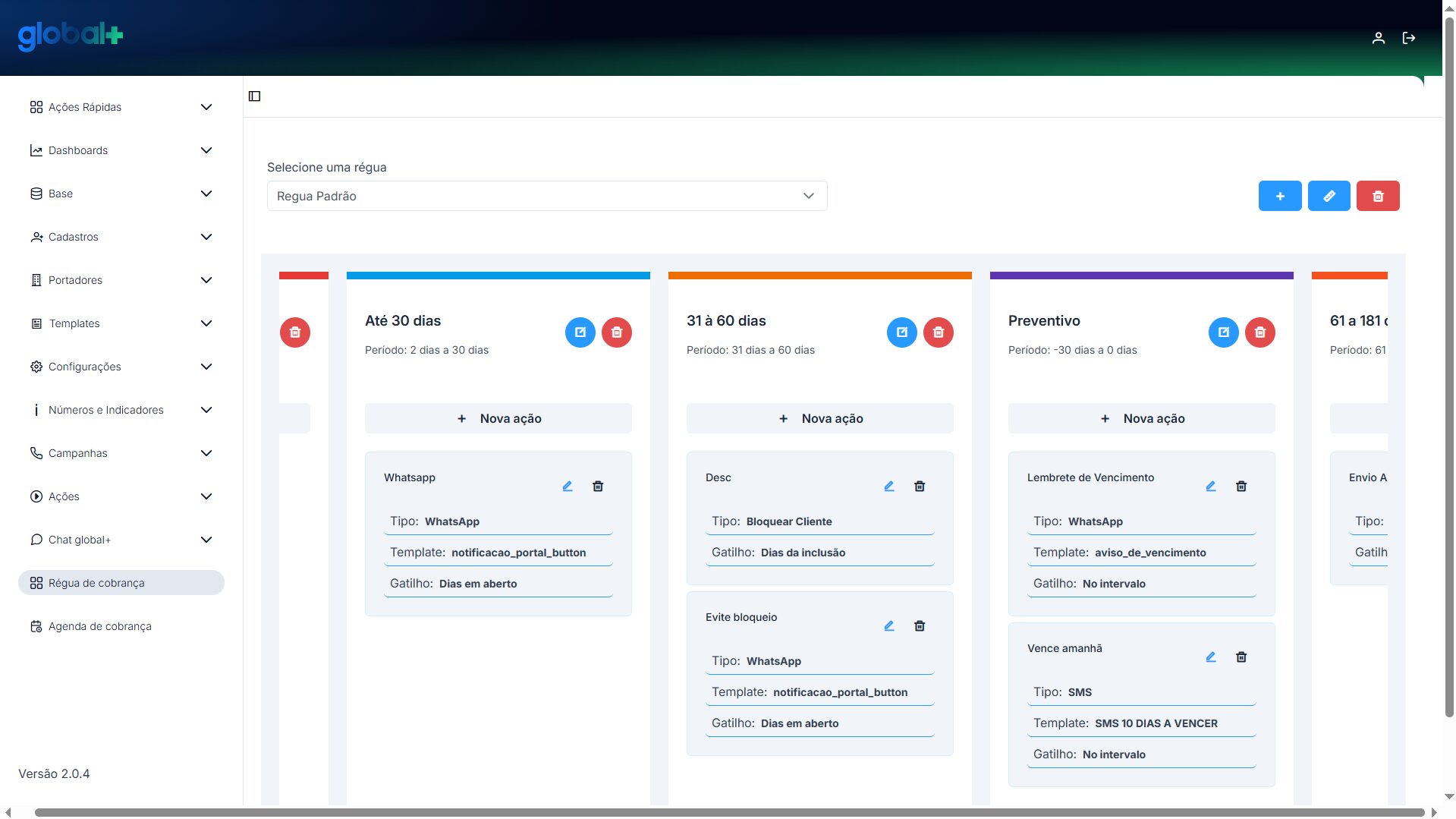 Unifique canais, personalize fluxos e ative ações automáticas em grande escala. Tudo isso com uma régua de cobrança sob medida para a sua operação e integração nativa com a cobrança terceirizada da Global.
